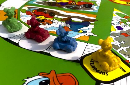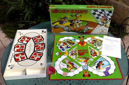 Tout le monde est Mickey : Mickey rouge, jaune, bleu ou vert. Et tous essayent de gagner 10 points en tournant le plus vite possible autour du circuit. À votre tour, vous lancez les dés et si vous arrivez sur une case vide, vous la remplissez avec une vignette tirée au hasard et en suivez les instructions. Mickey Rallye aurait pu être un jeu de pur hasard. Mais une vignette « Échange » vous offre un choix : sélectionnez une autre vignette qui vous convient et posez-la sur la case avant d'en suivre les instructions. La variante présente un peu plus d'intérêt. Au lieu de piocher une vignette, vous en choisissez une parmi celles reçues en début de partie. En fait, on n'y jouera probablement jamais. Si Mickey Rallye a rejoint la collection, c'est uniquement pour le charme des petites voitures de Mickey !
