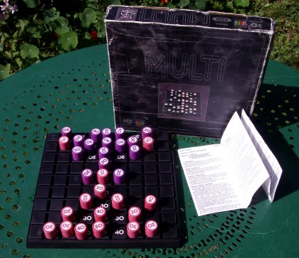 Multi score s'adresse à deux joueurs. Le jeu est basé sur le principe des Dames chinoises ou du Jeu de l’Halma. Mais ici, on n'attend pas que toutes les pièces aient changé de place. Dès qu'un joueur a envoyé dix de ses pièces en face, le jeu s'arrête, et on compte les points. Chaque pion arrivé en face multiplie sa valeur par la valeur de la case qu'il occupe. Les cases les plus chères sont aussi les plus éloignées… évidemment. L'idée est intéressante, mais le jeu est assez ennuyeux. Malgré le nom du jeu, on ne multiplie pas les parties. |