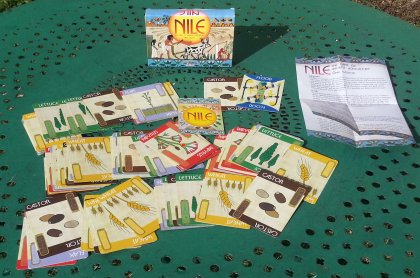 Nile vous propose de devenir agriculteur au temps des pharaons. Il vous faudra un peu de chance mais aussi un bon sens tactique pour engranger les récoltes de cinq produits différents, sachant que c'est la plus faible de vos récoltes qui déterminera vos points de victoire, un peu comme dans Tigre & Euphrate. Pour cela, il faudra choisir entre forcer le destin par des échanges de cartes à deux contre un, ou attendre que la chance vous favorise enfin en accumulant les récoltes tout en espérant que la richesse manquante arrive un jour. Cet agréable et rapide jeu de pioche est hélas desservi par des cartes de qualité abominable, problème corrigé dans la seconde version dite « Deluxor ».