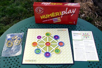 Équiplay est le troisième jeu proposé dans le coffret Numériplay. Le but est d'obtenir autant de points blancs que de points noirs. La notion d'égalité et d'équilibre est plus difficile que celle développée dans Quadruplay ou Octuplay, alors même que le jeu est strictement le même : toutes les cases baissent de 1 point, et les cases vierges deviennent des cases « – 1 » représentées par des points noirs. Le but est donc de totaliser 0, soit autant de points blancs que de points noirs. On commence par poser alternativement un anneau. Si, à la fin de la pose, personne n'est parvenu à collectionner autant de points blancs que de points noirs, on continue en déplaçant à tour de rôle un anneau. On est obligé de jouer, même si cela nous désavantage. Il arrive qu'un joueur ne puisse pas jouer : c'est le seul cas où il est possible de passer. Entre joueurs plus expérimentés, on interdit au premier joueur de commencer par une case contenant un point noir (et non un point blanc comme indiqué par erreur dans la règle), ce qui lui offrirait une stratégie gagnante. |