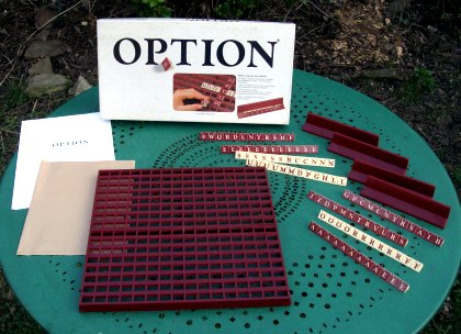 Les tentatives pour détrôner le fameux Scrabble sont nombreuses. Option se présente sous la forme d'un jeu de mots croisés, l'originalité étant que les lettres ont deux valeurs et deux couleurs possibles. On peut ainsi tourner une lettre à l'occasion de la pose d'un nouveau mot, à condition que tous les mots visibles ensuite restent valables. Une prime est accordée aux mots unicolores.