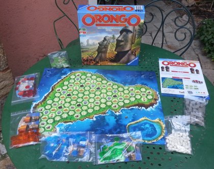 Sur le thème de l'Île de Pâques et de ses géants, Reiner Knizia a imaginé Orongo, un jeu basé sur un de ses mécanismes favoris : les enchères simultanées cachées. Chacun mise des coquillages. Seul celui qui a misé le plus perd sa mise. En échange il reçoit le droit de poser trois marqueurs et surtout de les placer en premier. Le second meilleur enchérisseur peut placer deux marqueurs. Les autres placent un marqueur. Pour gagner des coquillages, une seule possibilité : ne rien miser ! Une mécanique originale. En plaçant leurs marqueurs, les joueurs s'efforcent de créer des groupes composés tant de ressources que de terrains au bord de la mer, seuls habilités à recevoir les statues. Le jeu est tendu et intéressant. Mais on regrette que le matériel soit aussi peu à la hauteur. D'abord, les jetons se détachent à peine du fond de la carte et sont vraiment difficiles à visualiser. Ensuite, la règle propose de poser les coquillages pour marquer les cases utilisées. Or ces coquillages roulent et se déplacent dès que quelqu'un tousse dans une maison du voisinage. On aurait préféré des cauris
