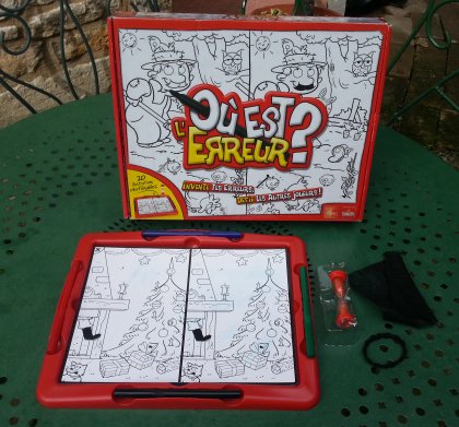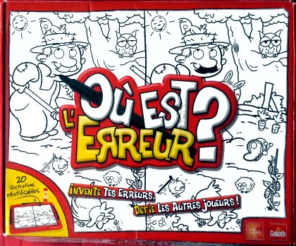 Qui ne s'est jamais adonné au jeu des erreurs dans les pages jeux de son journal ? Plusieurs jeux de société ont été tirés de cette idée comme Cherchez les différences ou Différences ?, qui proposent des cartes ou des planches où sont cachées de subtiles modifications. Dans Où est l’erreur ?, c'est vous qui allez introduire les différences entre les deux dessins ! Pour cela, vous disposez d'un feutre effaçable noir à pointe fine avec lequel vous allez ajouter des détails sur l'un ou l'autre côté de la feuille. Puis, vos adversaires devront trouver ces erreurs. La limite du jeu, c'est son feutre noir. Si un joueur appuie trop dessus et que sa pointe s'émousse, il vous faudra vous en procurer un nouveau sans quoi les parties perdront de l'intérêt.