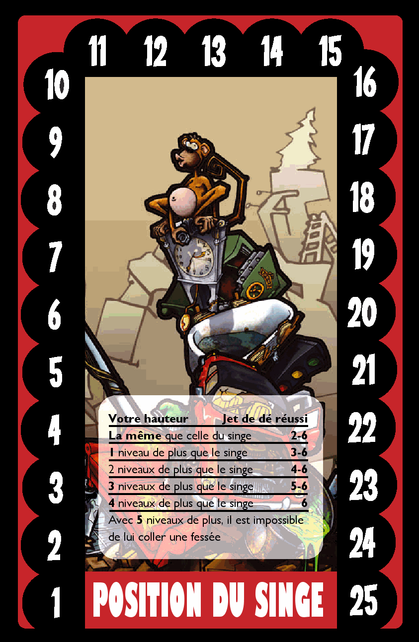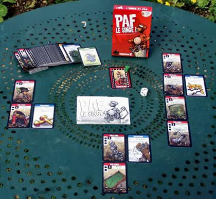 Paf le singe est l'adaptation française de Spank the Monkey, un jeu de cartes à poser. Le but est de donner une claque au singe qui trône en haut d'une pile d'ordures dans une décharge du même nom. Pour cela, vous posez des cartes qui permettent d'aller toujours plus haut. Si vous êtes sérieux, vous construisez avec de solides éléments, que vous empilez selon les normes de construction en vigueur. Mais vous avez alors peu de chance d'atteindre le singe le premier. Il faut donc vous résoudre à construire des ensembles bringuebalants, tout en restant humble et discret, afin qu'il ne vienne pas à l'idée d'un ennuyeux de vous ennuyer. Car le jeu contient certes des éléments de construction, mais aussi des armes de destruction…
