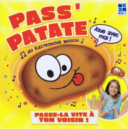 Plusieurs jeux sont dérivés de La Patate chaude, un grand classique qui ne nécessite pour jouer qu'une pomme de terre brûlante et un tourne-disque ou un i-machin. Ces jeux étaient généralement basés sur un minimum de culture : énoncer des mots en relation avec un son ou un domaine. Avec Pass’Patate, on revient aux fondamentaux : plus de prétexte culturel, on se lance simplement la patate en espérant ne pas l'avoir quand elle cessera de jouer sa musique. Quelques chips en carton complètent le tout, qui est rangé dans un grande boîte pleine de vide, comme les affectionnent les rayons des grandes surfaces.