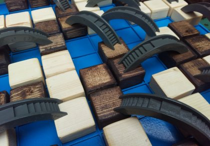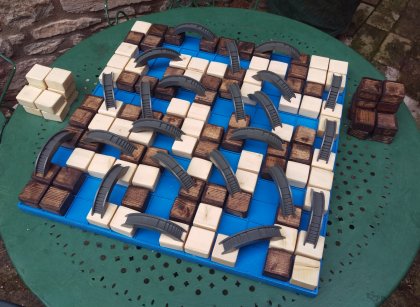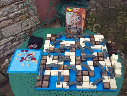 À l'Escale à jeux, on aime les jeux surdimensionnés, surtout quand ils ne se limitent pas au domaine des jeux de dextérité. La version éditée par Hans im Glück en 2007 de Ponte del Diavolo se limite à un tablier de 10 × 10 cases, ce qui est insuffisant aux dires des amateurs de jeux combinatoires qui préfèrent jouer sur un tablier de 12 × 12. Nous avons donc entrepris de réaliser une version 12 × 12 et, tant qu'à faire, nous avons décidé de la proposer en version géante.