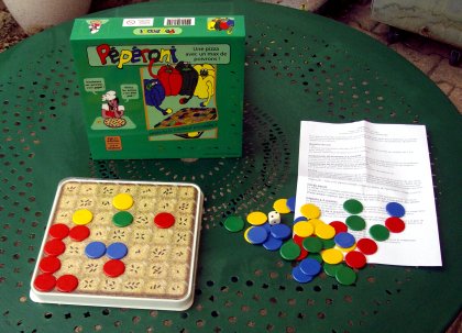Le tablier de jeu de Pépéroni est censé représenter une pâte à pizza carrée aux graines de sésame, sur laquelle les apprentis pizzaiolos vont tenter de répartir aussi régulièrement que possible des morceaux de poivrons de leur couleur, tout en veillant à ruiner la répartition de leur adversaire. Certes, le thème nécessite une capacité de déglutition hors du commun pour être avalé (il existerait donc des poivrons bleus ?), mais cet effort est nécessaire – gloups ! –, car Pépéroni est vraiment un bon jeu. À son tour, chaque joueur lance le dé et place un jeton de la couleur de son choix (pas forcément la sienne) sur une des cases correspondantes du plateau (1 trait = 1 grain de sésame = 1 point sur le dé). Le but est d'obtenir, à la fin du jeu, un plus grand nombre de morceaux de poivrons à sa couleur que ses adversaires, sachant que les jetons d'une même couleur qui se touchent (pas ceux en diagonale, donc), comptent pour un seul morceau de poivron. À deux joueurs, chacun possède deux couleurs, une dominante et une secondaire (utilisée pour départager d'éventuels ex-æquo). Variante Escale à jeuxLorsque le dé désigne des cases qui ne sont plus disponibles, plutôt que de placer le pion d'un adversaire sur n'importe quelle case, on considère que l'on peut jouer normalement (ses jetons ou ceux des autres), mais sur le nombre immédiatement supérieur disponible sur le plateau (un 3 devient un 4, ou un 5 si ce n'est pas possible, etc. – un 6 devient un 1.) |