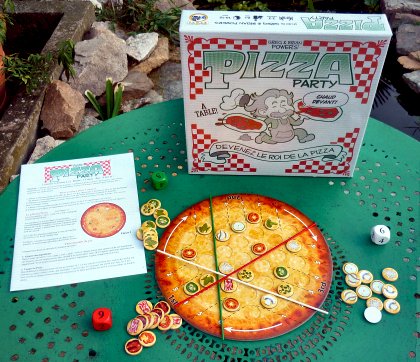 Pizza Party ne vous laissera pas sur votre faim. Les parties sont rapides et c'est heureux, car le jeu appartient à la catégorie « plus tu perds, plus tu perds ». Difficile en effet de rattraper un mauvais départ. Mais comme la durée d'une partie dépasse rarement cinq à dix minutes, on s'en remet assez vite. Pizza Party est basé sur le principe du choix simultané. Après avoir ajouté deux ingrédients à sa couleur, chacun décide secrètement où il va tirer un trait de coupe sur la pizza. On révèle alors les décisions et la pizza se retrouve découpée en six ou sept morceaux. Dans chaque portion, la couleur majoritaire transforme les ingrédients minoritaires en ingrédients de sa couleur, et c'est parfois très brutal ! Les joueurs à la traîne en sont parfois réduits à lancer le dé au lieu de le positionner, tant il leur semble que le hasard ne peut pas être pire que ce qu'ils vivent. La vie est parfois très dure pour les amateurs de pizza. On notera avec étonnement que l'éditeur a trouvé le seul fabriquant de dés qui ne sache pas que le six doit être au dos du un, le cinq au dos du deux et le quatre au dos du trois. Cela s'avère un peu troublant quand il s'agit de trouver rapidement et secrètement un chiffre donné.