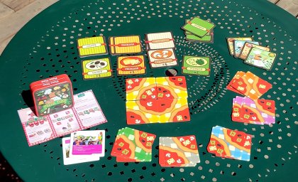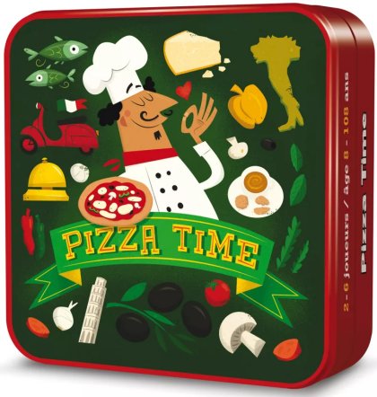 Aujourd'hui, les clients ne sont pas très difficiles. Ils n'exigent qu'une quantité exacte pour deux des quatre ingrédients de leur pizza. Une fois révélées les quatre quantités souhaitées en champignons, poivrons, fromages et olives, vous devez rapidement (d'ou le titre du jeu Pizza Time) composer avec vos quatre cartes double face une pizza qui contienne deux des ingrédients comme demandé par le client. Et c'est plutôt facile. Malheureusement, plus la soirée avance, plus le client est exigeant. Lors des manches trois et quatre, il veut trois ingrédients exacts. Et lors des deux dernières manches, il faut respecter les quatre ingrédients ! Variante Escale à jeuxUn joueur qui gagne la manche doit inclure un ingrédient de plus lors de la manche suivante. Le vainqueur est le premier à reconstituer une pizza avec quatre quantités respectées, quelque soit la manche en court, mais il doit bien sûr être le premier à terminer sa pizza lors de cette manche.