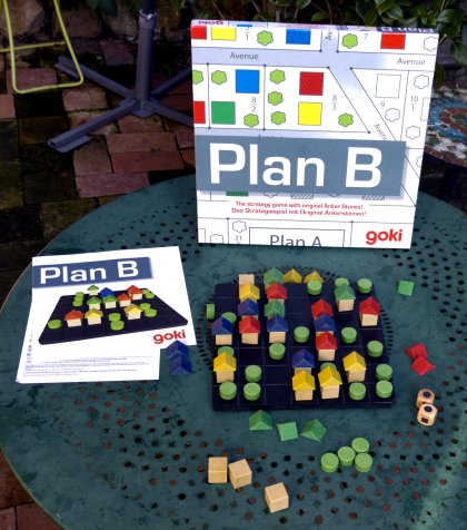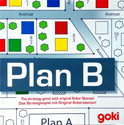 Goki est un fabriquant de jouets allemand pour très jeunes enfants ; mais de temps à autre, l'éditeur commet aussi un jeu de société. Plan B a été conçu par Jürgen Knischewski, un designer graphiste travaillant chez Goki. Ce qui ressemble de prime abord à un jeu de construction en pierres reconstituées est un jeu mêlant hasard du dé et tactique de placement et de déplacement. Une maison n'appartient définitivement à un joueur que lorsqu'il en a posé le toit. Il est tentant de laisser les autres poser les bâtiments et de se contenter de poser les toits, mais le hasard ne vous le permet pas toujours et lorsque vous aurez posé vos sept toits, il faudra bien vous occuper du but du jeu : placer trois de vos bâtiments côte à côte. Ce sera possible grâce aux échanges de place : vos bâtiments sont en fait des mobile homes qui vont changer de place avec d'autres constructions ou même des arbres (qui doivent être en pots). Astucieux.