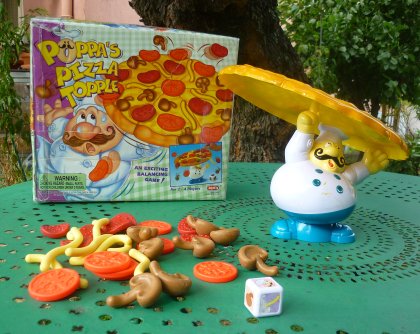 Poppa’s Pizza Topple est un classique jeu d'équilibre qui rappelle un peu Bamboleo. Après avoir pris l'apéritif chez Max le serveur, vous voici donc rendus chez Poppa, le roi de la pizza. Pour gagner, il faudra être le dernier en jeu. À tour de rôle, les joueur lancent le dé et agissent selon le résultat. S'ils tirent le chef, ils sont dispensés de poser un ingrédient. S'ils tirent le joker, ils choisissent un ingrédient et le posent sur la pizza. S'ils tirent un ingrédient, ils doivent le poser sur la pizza. Il n'y a pas de contrainte de pose. On peut même superposer les tranches de tomate. La pizza tient en équilibre sur le doigt de Poppa. Lui-même tient solidement sur ses pieds, mais il est possible de le poser à même la table de jeu, sans ses pieds, ce qui rend l'ensemble encore plus instable.