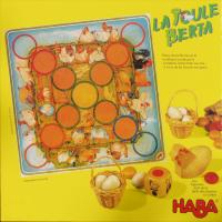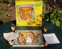 Le jeu, entièrement basé sur le hasard (et alors ?), consiste à tirer des grains de maïs du sac, pour en parsemer le chemin qui sépare la Poule Berta de notre nid. Puis il faudra avoir de la chance au dé pour que la poule picore dans notre direction. Tout le matériel, plan de jeu compris, est en bois d'arbre, sauf les paniers qui sont en osier. Un véritable bonheur… Qui me prête ses enfants ? |