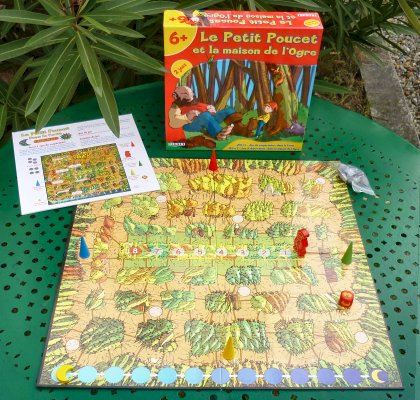 Le premier, un jeu de coopération, Le Petit Poucet et la Maison de l’Ogre - Dans la forêt, consiste pour le Petit Poucet à retrouver tous les cailloux qu'il a semés avant la tombée de la nuit. Trois de ses frères peuvent lui donner un coup de main (un dé permet, comme dans de nombreux jeux coopératifs, de simuler l'arrivée progressive de la Lune). Certains cailloux sont piégés (des loups sont cachés à proximité) et nécessitent une entraide de la part des joueurs pour s'en libérer. Il est possible de rendre la partie plus difficile en augmentant le nombre de loups cachés… Une manière bien sympathique de faire vivre un conte au delà de l'heure du coucher… |