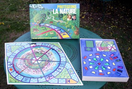 Protégeons la nature est doté d'un très beau matériel, avec un tablier de forme originale et inhabituelle, les mêmes bonshommes que dans Richesses du monde, du même éditeur, et les arbres et animaux à l'avenant. Le but du jeu, louable, est comme son nom l'indique de protéger la nature. Malheureusement, la règle est insipide. Qu'il s'agisse de la règle de base ou de celle pour les joueurs plus chevronnés, on n'a pratiquement aucune décision à prendre, et on se laisse guider par le hasard. Le livret « pédagogique », qui accompagne la règle, est en fait le principal intérêt de cette publication. |