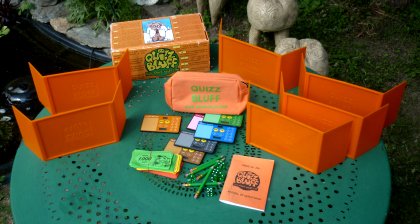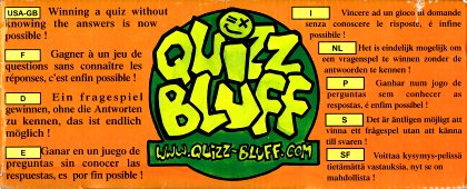 Quizz Bluff est un jeu incroyable ! Le matériel proposé est tout simplement bluffant : six énormes paravents en plastique épais, des billets, des dés, des crayons et six calculettes permettant à la fois de poser les questions et de trouver les réponses. Tout, sauf les paravents, tient dans une banane d'un effet redoutable. Le jeu, hélas, se limite à poser des questions à choix multiple ou des classements. Quizz Bluff restera à la place qui lui convient le mieux : au musée !