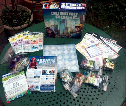 J'aime les jeux d'urbanisme ! Je ne pouvais donc pas passer à côté de Quadropolis. Comme souvent dans ce type de jeux, vous devez construire des bâtiments qui rapporteront d'autant plus de points qu'ils seront en accord avec leurs voisins. Comme dans Big City, les parcs valorisent les habitations. En toute logique, les fabriques ont besoin de commerces pour écouler leur production, etc. Le système de prise de tuiles est simple mais tordu : si vous récupérez une tuile à l'aide de votre architecte numéro 2, vous devez alors placer cette tuile en ligne 2 ou en colonne 2 (en mode expert, c'est un peu plus compliqué que ça). Il peut arriver, en fin de manche, que vous ne puissiez pas utiliser votre dernier architecte, d'où l'intérêt de prendre la tuile qui permet de jouer en premier lors de la prochaine manche. Un mode « Expert » propose des contraintes encore plus complexes. Et les fans ne manqueront pas de récupérer quelques extensions auprès de leurs revendeurs ou lors de festivals. Règle simple, très belle réalisation. Que demander de plus ?