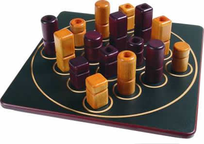 Seize pièces composent le jeu. Huit sont blanches, huit autres sont noires. huit sont hautes, huit sont basses. Huit sont carrées, huit sont rondes. Huit sont pleines, huit sont creuses. Chacun à son tour choisit une pièce qu'il donne à l'adversaire. Ce dernier doit la poser en tentant de former une ligne de quatre pièces identiques : couleur, hauteur, forme ou densité. Bien sûr, il n'y parvient pas. Le but n'est pas de gagner par hasard quand l'adversaire nous donne une pièce qui permet de remporter la partie, mais bien plutôt de le forcer à vous donner une telle pièce.