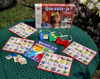 Que suis-je ? porte bien son nom : comme dans de nombreux jeux, il vous faut deviner qui vous êtes, ici plus exactement quelle est votre activité. Le choix est cependant limité à 20 possibilités, et les questions sont elles aussi encadrées : vous devez poser une question en rapport avec la zone où s'est arrêtée la flèche du tourniquet. Plus anecdotique que véritablement intéressant, Que suis-je ? est en fait une adaptation plutôt bridée du classique jeu des métiers. On notera que, sur la boîte, la petite fille porte son nœud papillon dans les cheveux, tandis que le petit garçon le porte au ras du cou. Mais ce n'est pas imposé par la règle ! |