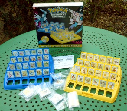 L'industrie espagnole est hélas assez coutumière du plagiat en matière de jeux de société et de jouets (et peut-être aussi en matière de moutarde allégée, mais j'avoue ne pas y connaître grand-chose). Aucune mention des auteurs ou de la licence n'est donc sur le jeu, qui reprend exactement le principe de Qui est-ce ?. Sauf qu'ici, au lieu de demander si le personnage est blond, on demande s'il traverse les murs où s'il boute le feu. 2008 : Cache cache PokémonEncore une autre version du jeu, toujours sans mention des inventeurs. Cette fois-ci, il faut retrouver le Pokémon de son adversaire par des questions pertinentes : « Ton Pokémon a-t-il l'air ridicule ? ».