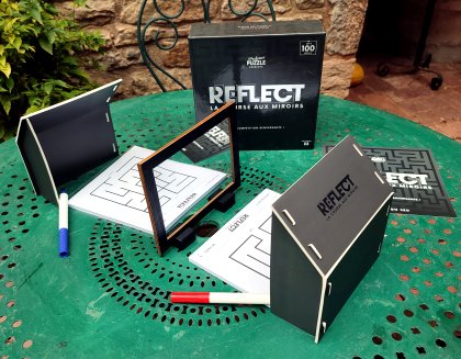 Lire un texte écrit en miroir, avec le haut en bas et inversement n'est pas aisé. Vous en faites ici l'expérience. Dessiner en miroir n'est pas plus facile et c'est le défi que vous lance l'éditeur Professor Puzzle avec son jeu Reflect. On peut jouer en solo, ce que je vous recommande pour ensuite avoir un peu plus de chance de battre votre adversaire. Mais c'est à deux que la pratique est la plus amusante. Le jeu est livré avec 100 défis que l'on peut rejouer inlassablement puisqu'on dessine avec des crayons ou des feutres effaçables sur un support transparent. Une expérience inoubliable.
