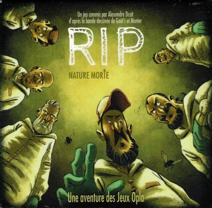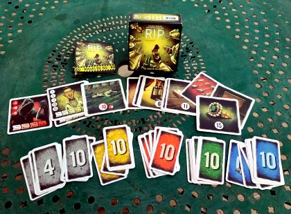 RIP se présente sous la forme d'un petit jeu de poche bien rempli avec plusieurs paquets de cartes. Le jeu est tiré de l'univers glauque de la série de BD éponyme, publiée chez Petit à petit éditions. Nous sommes donc des nettoyeurs, chargés de débarrasser les scènes de crimes de ce qui les encombre (RIP, du latin requiescat in pace, repose en paix). Mais comme nous sommes de vilaines personnes, nous sommes parfois plus intéressés par la gain procuré par les quelques biens de valeur qui traînent dans les lieux que par notre mission, quitte à ne pas s'embarrasser des autres collègues (RIP, de l'anglais ripper, éventreur). RIP est un jeu de collecte à base d'enchères et de bluff, servi par un thème et des dessins noirs à souhait. Les parties rapides font de RIP un jeu idéal entre deux jeux plus sérieux et plus longs.