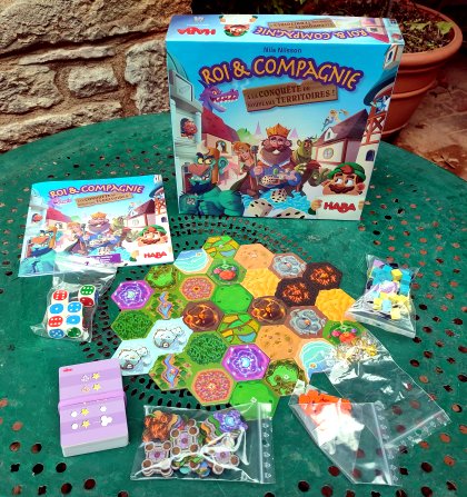 Roi & Compagnie - À la conquête de nouveaux territoires ! fait référence à Roi & Compagnie, partage le même univers et les mêmes principes. Mais le plaisir de jeu est bien plus important. Pour prendre plaisir au jeu, il faudra d'abord vous farcir les règles. Autant le jeu est agréable à jouer, autant les règles sont particulièrement mal écrites. Comme s'il fallait le mériter pour y jouer ! Idéalement, faites-vous expliquer le jeu ou trouvez une vidéo. La nouveauté intéressante de Roi & Compagnie - À la conquête de nouveaux territoires !, c'est la manière de gagner ou conquérir des territoires. Les cartes gagnées aux dés permettent de placer des châteaux, d'en voler à des adversaires, de gagner des trésors, etc. De plus, les cartes gagnées deviennent des jokers qui pourront aider lors des tours suivants si on n'a pas de chance aux dés. Et si par malheur on ne parvient pas à gagner une carte lors de son tour, on gagne un super-joker qui facilitera bien la vie lors d'un prochain tour. L'essayer, c'est l'adopter !
