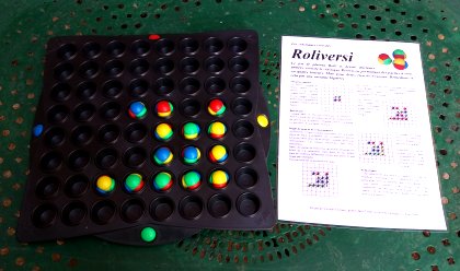 Roliversi est un jeu imaginé par Vincent Everaert pour profiter du matériel du jeu Rolit lorsqu'on n'est que deux joueurs. Le principe est que chaque joueur utilise deux couleurs — les chaudes rouge et jaune pour l'un, les froides bleu et vert pour l'autre — et que les retournements se font en encadrant des pions ou des séries de pions entre deux billes de couleurs différentes. La bille posée détermine la nouvelle couleur des billes adverses transformées. L'idée est originale mais au final, je crois que je préfère jouer au bon vieux Othello ! |