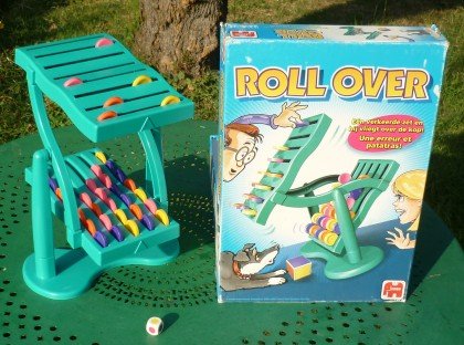 Une fois la grosse balance assemblée, on place sur le plateau du haut quatre jetons – un de chaque couleur. Tous les autres jetons sont placés sur le plateau du bas. Le jeu peut démarrer. À tour de rôle, on jette le dé. S'il indique une couleur, on déplace un jeton de cette couleur du plateau inférieur vers le plateau supérieur. L'équilibre est donc de plus en plus précaire. Parfois, le dé impose de pousser le plateau inférieur de la balance jusqu'à ce que tous les jetons roulent vers l'autre extrémité. Si le système bascule et que tout tombe alors, vous avez perdu ! Le matériel, bien conçu, résiste au temps. Amusant ! |