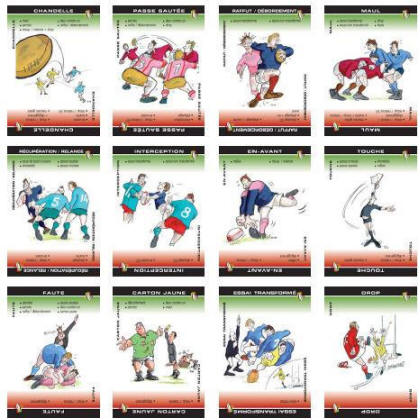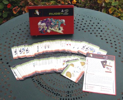 Avec 8 cartes en main, vous tentez de mener une attaque gagnante, jusqu'au moment où vous pouvez placer un drop ou tenter un essai. Bien sûr, l'adversaire peut vous contrer et mener à son tour une attaque. Pas besoin de connaître la tactique du jeu, puisque chaque carte comporte les actions offensives ou défensives qui peuvent suivre. Il suffit donc d'enchaîner les cartes, la conception du jeu amène la fluidité qui le rend si agréable à jouer. Les cartes sont de qualité et les dessins amusants, ce qui ne gâche rien.