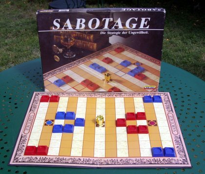 Le mécanisme principal de Sabotage, aller prendre un pion et l'amener à une base, fait penser à la fois à Intercept et à Diaballik, mais aussi à d'autres jeux moins connus utilisant le même ressort ludique. Mais Sabotage a aussi un peu de Lines of Action : les pièces se déplacent en effet selon le nombre de pièces qui les avoisinent, sauf qu'ici ne sont prises en compte que les pièces se trouvant sur la même rangée. Le jeu est aussi simple à mettre en œuvre que passionnant à jouer. Il est introuvable ? Pas tant que ça. Et puis… il est franchement facile à reproduire. |