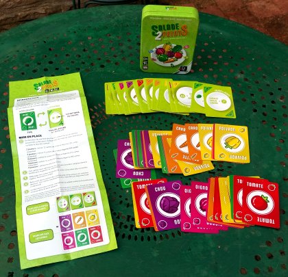 Les parties de Salade 2 points s'enchaînent sans jamais se ressembler. Les joueurs collectent à tour de rôle des contrats et des légumes en essayant de faire que tout cela s'accorde à la fin de la partie. Les 108 cartes contiennent sur une face l'un des 6 légumes et sur l'autre face un objectif. Parfois, cet objectif peut comporter des termes négatifs, par exemple + 2 points par tomate collectée en fin de partie mais – 1 point pour chaque carotte. On ne sait jamais à l'avance quels contrats vont apparaître et quand par hasard un contrat qui vous convient est révélé, vous n'êtes pas du tout certain de pouvoir le prendre lorsque votre tour viendra. La grande variété des contrats et le renouvellement des parties qui en découlent sont les points forts de ce petit jeu de cartes qui tient dans une poche et qu'on emportera volontiers dans les réunions de 6 personnes, le nombre idéal en période de pandémie