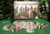 Un jeu portant le nom d'une ville aussi prestigieuse ne pouvait être réalisé avec des matériaux médiocres. Piatnik a donc opté pour des pierres de la célèbre marque de jouets de construction Anker. Le reste du matériel est de la même veine, avec de jolis jetons, en bois et des tuiles en carton épais dans les tons pastels. Pour construire des tours, les nobles rivaux essayent de gagner de l'influence auprès des guildes qui sont installées dans les quartiers de la cité. Lorsqu'un joueur parvient à constituer un ensemble contigu de 4 quartiers différents, il place une tour sur l'un de ces quartiers. De ce fait, le quartier maintenant occupé devient inopérant pour créer de nouveaux ensembles de 4 quartiers, que ce soit pour son propre intérêt ou pour un autre joueur. La seule part de hasard, totalement négligeable, vient de la distribution initiale des cartons entre les joueurs. On pourrait décider que les cartons soient attribués par choix successif des joueurs, ce qui enlèverait tout hasard dans le jeu. Nous sommes donc en présence d'un jeu beau, rapide, agréable à manipuler, intéressant, sans hasard, et qui permet de faire jouer de 2 à 4 joueurs à partir de 8 ans. Il n'en fallait pas plus pour que San Gimignano plaise immédiatement aux joueurs jeunes ou moins jeunes à qui j'ai présenté le jeu. Lorsque San Gimignano a été nommé au Spiel des Jahres, il était totalement inconnu. Souhaitons bonne chance à son auteur, Duilio Carpitella, dont c'est apparemment le premier jeu édité. |
