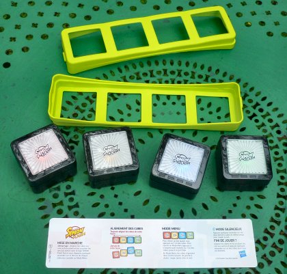 Quatre règles de jeux sont disponibles avec Simon Flash, allant du classique Simon au Mastermind. Les cubes que vous avez en main possèdent une face supérieure qui change de couleur (vert, rouge, jaune et bleu) selon les jeux et les manipulations. Les quatre cubes doivent toujours former un alignement rectiligne. Chacun de ces cubes est alimenté par deux piles AAA (LR03), soit un total de huit piles. Certes, le jeu est fourni initialement avec des piles, mais comme ce jeu ne finira probablement pas au fin fond d'un obscur placard, il est prudent de prévoir le rapprovisionnement. Les quatre règles proposées sont :