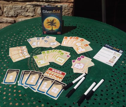 Le monde de l'édition ludique a redécouvert le plaisir de cocher des grilles, comme au bon vieux temps du Jeu de bingo. Chacun y va de son jeu de grilles à cocher, avec des résultats variables. Silver & Gold est plutôt à classer du côté des réussites, avec des règles vite assimilées, un soupçon d'interaction et un format qui permet d'emporter le jeu partout. De deux à quatre joueurs s'affrontent pour explorer des îles (cocher des cases sur des plans) dans le but de les découvrir entièrement (cocher toutes les cases) pour gagner les trésors cachés sur ces îles (les points marqués en haut et à gauche de la carte). Quelques cases offrent des avantages à celui qui les coche. Les mécanismes sont proches de ceux employés dans Second Chance ou Patchwork Doodle. La nouveauté est dans le renouvellement des cartes à remplir. Il est parfois judicieux de remplir au plus vite une île pour récupérer la carte intéressante au centre de la table avant les concurrents. En prévision de nombreuses parties, nous avons choisi de plastifier les cartes à l'Escale à jeux.