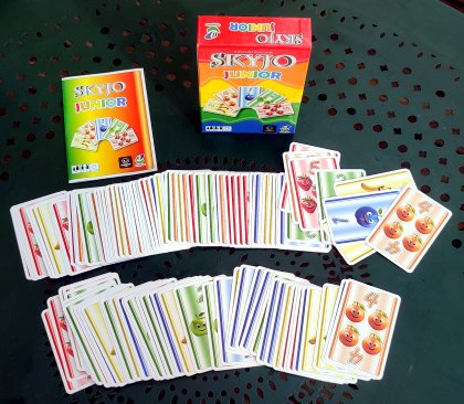 Skyjo Junior est l'adaptation du best-seller dérivé du classique Golf. On passe de 12 à 5 valeurs de cartes et des petits dessins de fruits (qui a raconté à l'éditeur que les enfants aimaient les fruits ?) remplacent les austères illustrations de son aîné.