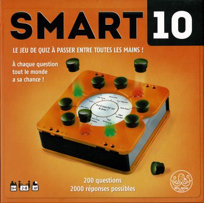 Encore un jeu de quiz ! Oui, mais… Smart 10 dénote par son matériel : les 200 questions – et 2000 réponses – sont présentées dans un appareil compact qui intègre même des molettes pour tenir les scores. Toutes les cartes comportent une question qui se rapporte à dix réponses possibles. Il existe six catégories de cartes :