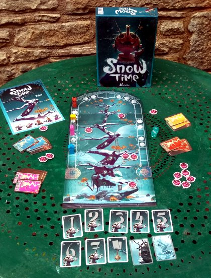 Winter is coming. Mais rassurez-vous, les seules batailles auxquelles vous aurez à faire face seront des batailles de boules de neige ! Dans Snow Time, vous incarnez le héros désigné par votre village, qui aura pour mission de se couvrir d'honneur sur l'arbre magique. Pour marquer des points, il faudra faire tomber vos adversaires, ramasser les fruits convoités et ne pas oublier de récolter le mana* qui se trouve (on se demande bien pourquoi) au pied de l'arbre. Gagner des points ne sera pas suffisant. Il faudra faire preuve d'astuce pour gagner les bons points au bon moment, car des bonus sont attribués aux plus opportunistes. Les jeux de choix simultané, fort prisés des auteurs ludiques, peuvent se transformer en chaos insupportable lorsque ces choix ne reposent que sur l'intuition. Ce n'est pas le cas dans Snow Time. On peut en effet juger de l'intérêt pour les uns et les autres de viser tel ou tel emplacement, selon leur place sur la piste de score. Untel aurait tout avantage à viser le mana. Un autre gagnerait à ramasser des fruits. Un autre encore devrait songer à récupérer des cartes tant sa main restante est appauvrie. Par ailleurs, les malheureux qui se sont fait éjecter de l'arbre à coups de boules de neige ne disposent provisoirement plus de certaines cartes. On est ainsi parfois assuré d'avoir peu de concurrence si on vise un emplacement où l'on est un des seuls à disposer de cette possibilité. Vous savez combien j'apprécie le beau matériel dans un jeu. Et bien là, je suis gâté par une très belle édition. * Mana (source CNTRL) :