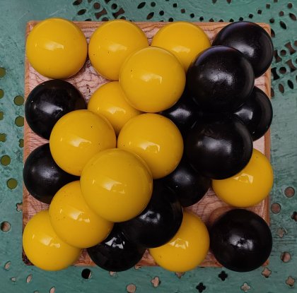 À deux joueurs, on peut rapidement arriver à une situation bloquée et la pyramide est rarement terminée. On va un peu plus loin à 3 joueurs puisqu'il suffit de deux billes sur une plate-forme pour en poser une nouvelle au-dessus.