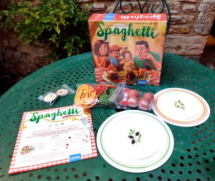 L'idée du jeu Spaghetti est intéressante. Plusieurs règles sont proposées, malheureusement toutes rédigées par quelqu'un qui croyait parler français. Elles sont donc aussi compréhensibles que celles que je pourrais rédiger moi-même en turkmène avec l'aide de Google Translate. Si vous parlez anglais, vous devriez pouvoir comprendre les règles qui sont toutes basées sur la dextérité et la rapidité : à tour de rôle, les joueurs prélèvent des spaghettis dans le plat en prenant garde de ne pas salir la table. Le matériel est intéressant et plutôt attrayant.