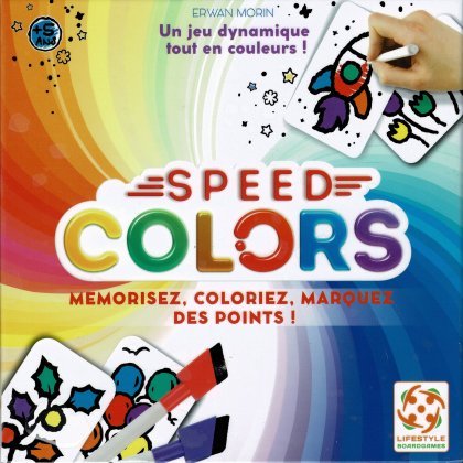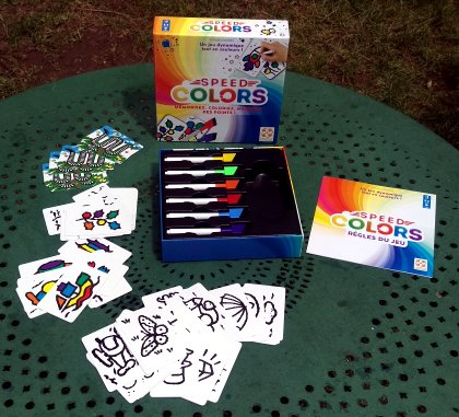 Pratiquer un jeu de société ou faire des coloriages : pourquoi choisir ? Speed Colors nous propose de jouer en coloriant. Au recto de chaque carte, un dessin avec six zones colorées en bleu, rouge, vert, jaune, orange et violet. Au verso, le même dessin en noir et blanc, à colorier. Vous l'avez compris : il va falloir colorier avec les bonnes couleurs que vous aurez préalablement mémorisées. Pas si simple qu'il n'y paraît ! Chaque zone correctement et entièrement coloriée rapporte deux points. Si la zone est bien remplie mais pas avec la bonne couleur, vous marquez quand même un point. Original !