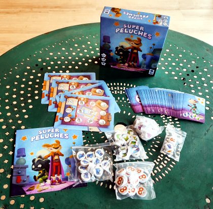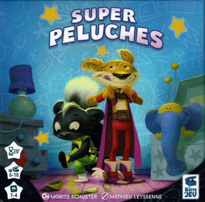 2 à 4 jeunes joueurs essayent de collecter les plus belles Super Peluches. Ils sont aidés dans cette tâche par deux dés magiques qui rapportent, la plupart du temps, des équipements permettant de transformer une peluche d'apparence ordinaire en super-peluche : bottes, capes, masques et gants. Si le hasard est important, il n'est pas seul à décider du gain de la partie. En particulier, le choix de revendiquer une super-peluche à 1 point de victoire tout de suite, ou d'attendre un peu pour espérer récupérer une super-peluche à 2 ou 3 points, peut être décisif car chacun ne pourra recruter que 4 super-peluches. À ma connaissance, Super Peluches est la première incursion, plutôt réussie, de l'éditeur bourguignon dans le domaine des jeux pour enfants. On apprécie en particulier le matériel de qualité : jolis dés et pions en bois épais. Petit bonus : un mode solo est proposé.