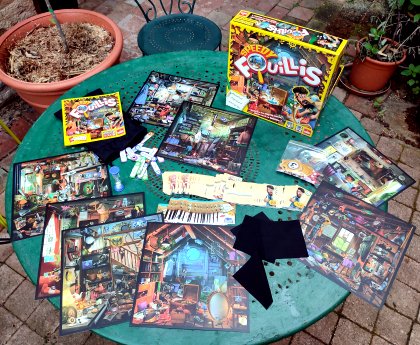 8 scènes différentes contiennent la totalité des 160 objets qu'il faudra retrouver. D'une part, on change de scène à chaque manche. D'autre part, chaque objet n'est pas toujours dessiné de la même manière. Les joueurs rivalisent pour découvrir rapidement les objets. Dans le mode expert, il est possible d'acquérir des cartes d'action en les échangeant contre des objets de même type. Ces cartes procureront un avantage certain pour la suite de la partie. Les auteurs sont très discrètement crédités en fin de règles. Mais l'illustratrice ou l'illustrateur restera inconnu(e), ce qui est regrettable quand on voit ses très belles réalisations.