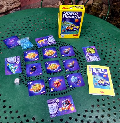 Dans Space Planets, la conquête spatiale se joue au dé ! À tour de rôle, les joueurs lancent le dé (valeur 1, 1, 2, 2, 3 et 3) vers les cartes disposées au centre de la table. L'idée est de parvenir à ce que le dé s'arrête sur une carte intéressante avec un petit nombre en face visible. En effet, la valeur du dé indique le prix à payer pour acheter la planète atteinte. Mais si la face du dé est élevée, il est possible de ne pas acheter la carte atteinte et, à la place, de gagner des points pour acheter plus tard d'autres cartes. Quelques cartes ont des effets spéciaux. L'idée est amusante qui mêle adresse et gestion légère.