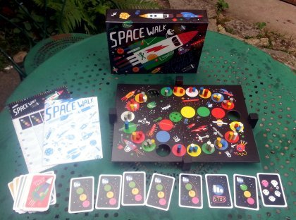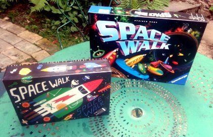Space Walk revient avec un nouveau design et une boîte deux fois plus petite. La taille du plan de jeu est cependant inchangée. Les vaisseaux spatiaux en plastique sont remplacés par des pions en bois, plus dans l'air du temps. La règle est inchangée, pour ceux qui le souhaitent. Mais vous pouvez aussi utiliser les cartes fournies dans cette nouvelle édition, à la place des jetons. Chaque joueur reçoit alors huit cartes qu'il devra toutes utiliser avant de les reprendre en main. Quatre cartes effectuent un mouvement standard, une carte permet de jouer deux fois de suite, une carte permet de copier le coup du joueur précédent, une carte permet d'avancer un seul vaisseau et la dernière carte oblige à passer son tour.