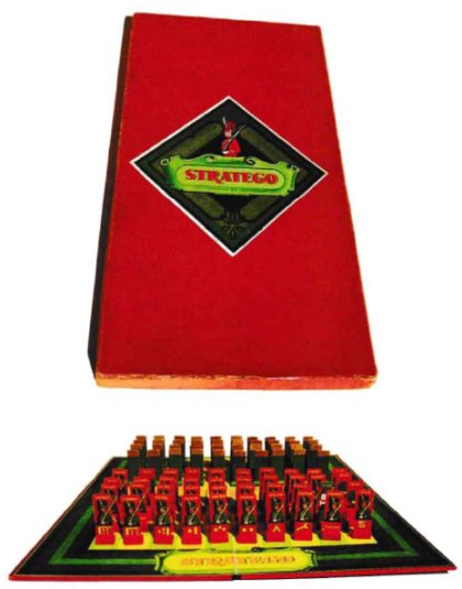 Histoire du StrategoLe Stratego est clairement issu de « L’Attaque », un jeu français inventé par Hermance Edan en 1908. La connexion improbable entre ces deux jeux a été établie et présentée par Fred Horn (La Haye) dans plusieurs publications et colloques dont celui sur les jeux qui a eu lieu à la Haute École de Bruxelles (Institut pédagogique Defré) en décembre 2013. Dans les années quatre-vingt, Fred Horn est invité par son frère à une réunion de voisinage où il a l’occasion d’y rencontrer Michel Voorn qui lui parle d’un jeu dénommé « Tek ». Fred Horn, ne le connaissant pas, accompagne M. Voorn qui lui montre ce jeu de fabrication artisanale dont les règles sont écrites sur un petit carnet : Fred Horn est alors stupéfait et remarque sur-le-champ la ressemblance entre « Tek » et l’ancien jeu français « L’Attaque ». Michel Voorn raconte ensuite que son père avait fabriqué ce jeu pendant la Seconde Guerre mondiale selon les instructions d’un officier de l’armée de l’air canadienne qu’il protégeait des rafles de la police allemande. Cet officier canadien, qui avait survécu à la destruction de son avion, est devenu un clandestin caché dans les sous-sols de la Haye avec d’autres fugitifs tel Jacques Johan Mogendorff, fugitif lui aussi en tant que juif. Ce dernier a certainement découvert « Tek » auprès du Canadien, puisque les personnes recherchées, et cachées, changeaient de lieux en permanence pour des raisons de sécurité. C’est dans ce contexte particulier que J. J. Mogendorff créé un nouveau design de jeu en s’inspirant de la fabrication artisanale de « Tek » ; il publiera son jeu sous le nom de « Stratego » aux éditions Smeets & Schippers. Cet éditeur commence à distribuer le « Stratego » à la fin de l’année 1944 avec un contrat d’édition d’une durée de 5 ans (1944-1949).
