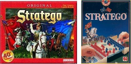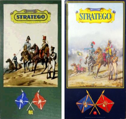 Il y a seulement quelques petites différences entre ces deux jeux, au niveau de la symbolique des pièces et du tablier. L’Attaque se joue sur un tablier de 9 cases sur 10 sur lequel chaque joueur place ses 36 pièces ; les passages d’un camp à l’autre se font par 4 couloirs entre trois rivières. Le Stratego se pratique sur un tablier de 10 cases sur 10 et chacun joue avec 40 pièces ; les deux camps sont séparés par deux lacs situés au centre du tablier, ce qui laisse trois passages pour atteindre le camp adverse. Quelques autres subtilités de prise du drapeau et de déplacement distinguent les deux jeux selon les versions. À partir de la fin des années cinquante, de nombreux jeux commercialisés ont été inspirés par la structure de L’Attaque-Stratego. CommentairesCette courte histoire du Stratego est un résumé de Michel Boutin à partir des contributions de Fred Horn (Stratego) et de Michel Boutin (L’Attaque) présentées à un Colloque organisé à la Haute École de Bruxelles (Institut pédagogique Defré) en décembre 2013, dont les actes ont été édités en janvier 2016. Voir les références ci-dessous : Art et savoir de l’Inde - Actes du colloque « Jeux indiens et originaires d’Inde » « Jeux indiens et originaires d’Inde », édité par Michel Van Langendonckt. L’ouvrage est disponible à la Haute École de Bruxelles, Catégorie pédagogique Defré, avenue De Fré, 62 - B 1180 Bruxelles ; tél.: +32 (0)2 374 00 99 ; e-mail : defre@heb.be Quelques boîtes de la collection de l'Escale à jeux1987 : édition Jumbo