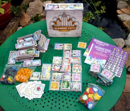 On aurait pu croire que le salon d'Essen 2012 était placé sous le signe de l'urbanisation. Les jeux sur ce thème étaient en effet nombreux, et une exposition, organisée par l'association des collectionneurs européens, leur était même consacrée. Sunrise City était l'une des créations les plus séduisantes dans cette catégorie, et c'est avec plaisir que j'en ai réalisé la traduction française. Les mécanismes et les règles facilement accessibles sont servis par un matériel hors du commun. Les bâtiments sont de très épaisses tuiles en carton et les joueurs disposent, pour leurs enchères, de gros jetons en bois imprimé. Même les points de victoire sont de belles étoiles en bois. On ne s'est pas moqué du client. Sunrise City se déroule en trois manches assez rapides. Après avoir pris secrètement connaissance des terrains et des bâtiments qu'ils ont piochés, les joueurs commencent par une phase de terrassement. Il s'agit d'agrandir la zone constructible en essayant à la fois de marquer des points et de préparer des emplacements pour ses constructions. Puis vient l'attribution des terrains à bâtir. Chacun pose à tour de rôle un jeton, chaque terrain appartiendra à celui qui y aura posé le dernier. Simple mais efficace. Enfin, vient la phase de construction. Les plus intéressantes sont les créations de nouveaux bâtiments sur des zones dont on a préalablement pris le contrôle, ou alors celles des étages très élevés. Lors de chaque manche, les joueurs disposent d'un rôle qui leur confère un pouvoir particulier. Ces rôles auront été attribués en début de partie par un draft. Aucun des mécanismes de Sunrise City n'est vraiment original, mais l'ensemble est parfaitement équilibré et très agréable à jouer. L'attribution des points de victoire est réglée par un mécanisme astucieux et pervers à souhait. Bonne pioche.