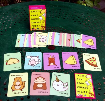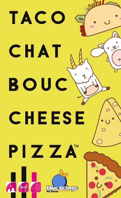 Taco Chat Bouc Cheese Pizza fait un peu penser aux jeux de type Pas 7 comme Houlala et Les Pieds dans le plat !. mais ici, au lieu de compter, on répète une ritournelle qui donne son nom au jeu : Taco Chat Bouc Cheese Pizza, tout en retournant, à son tour de jouer, la première carte de son jeu sur le paquet au centre de la table. Lorsque le mot prononcé correspond à la carte retournée, il faut rapidement taper sur le paquet au centre de la table. La dernière main ramasse toutes les cartes. Trois cartes spéciales demandent aussi de taper sur le paquet mais il faut auparavant faire un geste convenu. La règle est simplissime. Taco Chat Bouc Cheese Pizza ne devrait pas détrôner Terraforming Mars ! Mais on se prend facilement et rapidement au jeu.