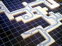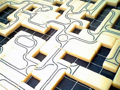 Tayü est non seulement un jeu de connexion, mais également un jeu de Niek Neuwahl ! Il semblait dès lors impossible qu'il échappe à une très bonne note sur le site de l'Escale à jeux ! Restait à essayer le jeu. Aucune déception ne m'attendait. Peut-être la mise en place est-elle un peu fastidieuse, avec la constitution d'un bloc de dominos qui ne demandent qu'à tomber. Mais il semble difficile de s'exonérer de cette phase, car le dos des dominos indique s'ils comportent des sorties sur trois faces ou sur moins, et le joueur doit pouvoir choisir entre ces deux grands types de dominos. Une fois en possession de votre domino, vous devez continuer un canal qui recouvre toute la carte. Le but de chacun des opposants est d'amener le canal vers ses bords du tablier.