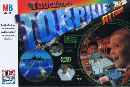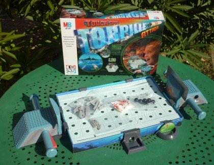 MB propose ici une amusante adaptation de la classique Bataille navale. Au jeu de déduction Touché-coulé - Torpille attaque ajoute maintenant une épreuve d'adresse. Une fois un vaisseau découvert, il faut le torpiller ! Pour cela, on va propulser des billes sous le plan de jeu. Les manettes de tir sont équipées d'un viseur à miroirs, qui sert à visualiser la coque du navire que l'on souhaite couler. En quelque sorte, il s'agit d'un périscope inversé puisqu'il permet de voir sous l'eau ! L'imposant matériel a bien du mal à tenir dans la boîte. Le contenu est cependant de qualité, avec peut-être quelques réserves sur les miroirs.